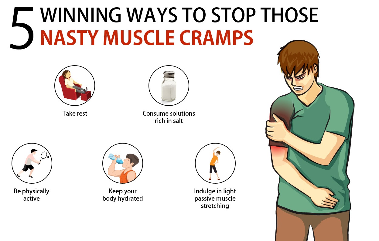 4. Keep your body hydrated Dehydration is the root of a number of troublesome conditions, muscle cramps being one of them. Make sure to always carry a water bottle with you and drink a minimum of 7-8 glasses of water on a daily basis.